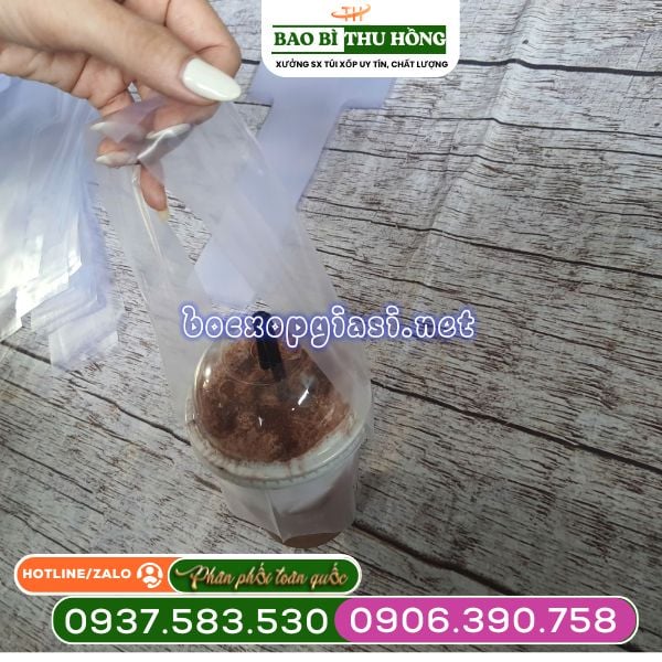 - Khả năng tương thích: Túi được thiết kế để phù hợp với các loại ly nhựa PP, ly nhựa PET và cả ly giấy từ size nhỏ đến size lớn.